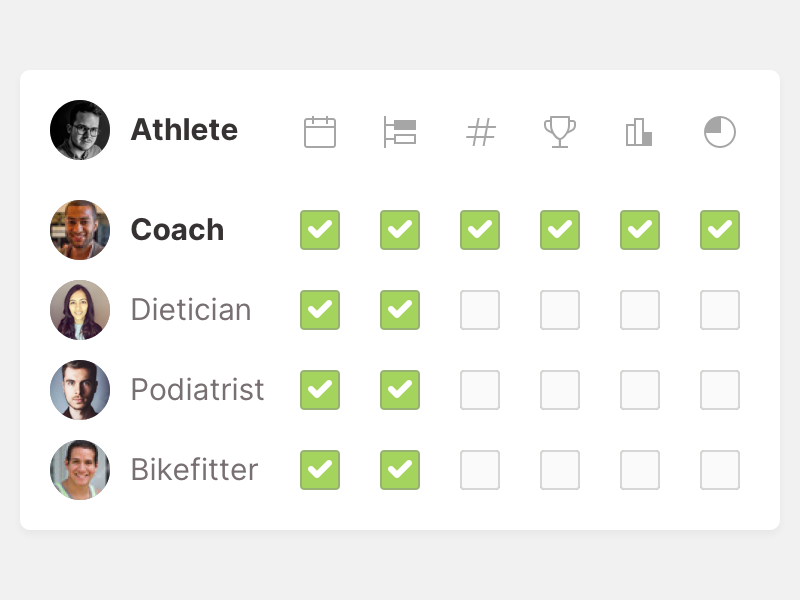 Work together with a team where each coach or team member has his/her individual expertise. Add users from different areas of expertise: Dietician, Osteopath, Podologist, Psychiatrist, Sports Doctor, Bikefitter, ... and work together toward predefined goals.